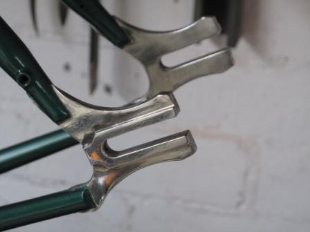 The build continued with a mixture of Reynolds 708 OS and Columbus tubes. Along with the dropouts that I machined and the stainless lugs that had been polished went a Walter BB. Apart from the need for extra cleanliness when joining stainless the construction is pretty much the same as a normal frame and given that the only stainless in the fork is in the dropouts then everything went as per normal.These dropouts go both inside and outside the tubes by virtue of two slots cut into them the same dimension as the tubing diameter. The bit on the outside of the tube after brazing gets filed down and in this case polished