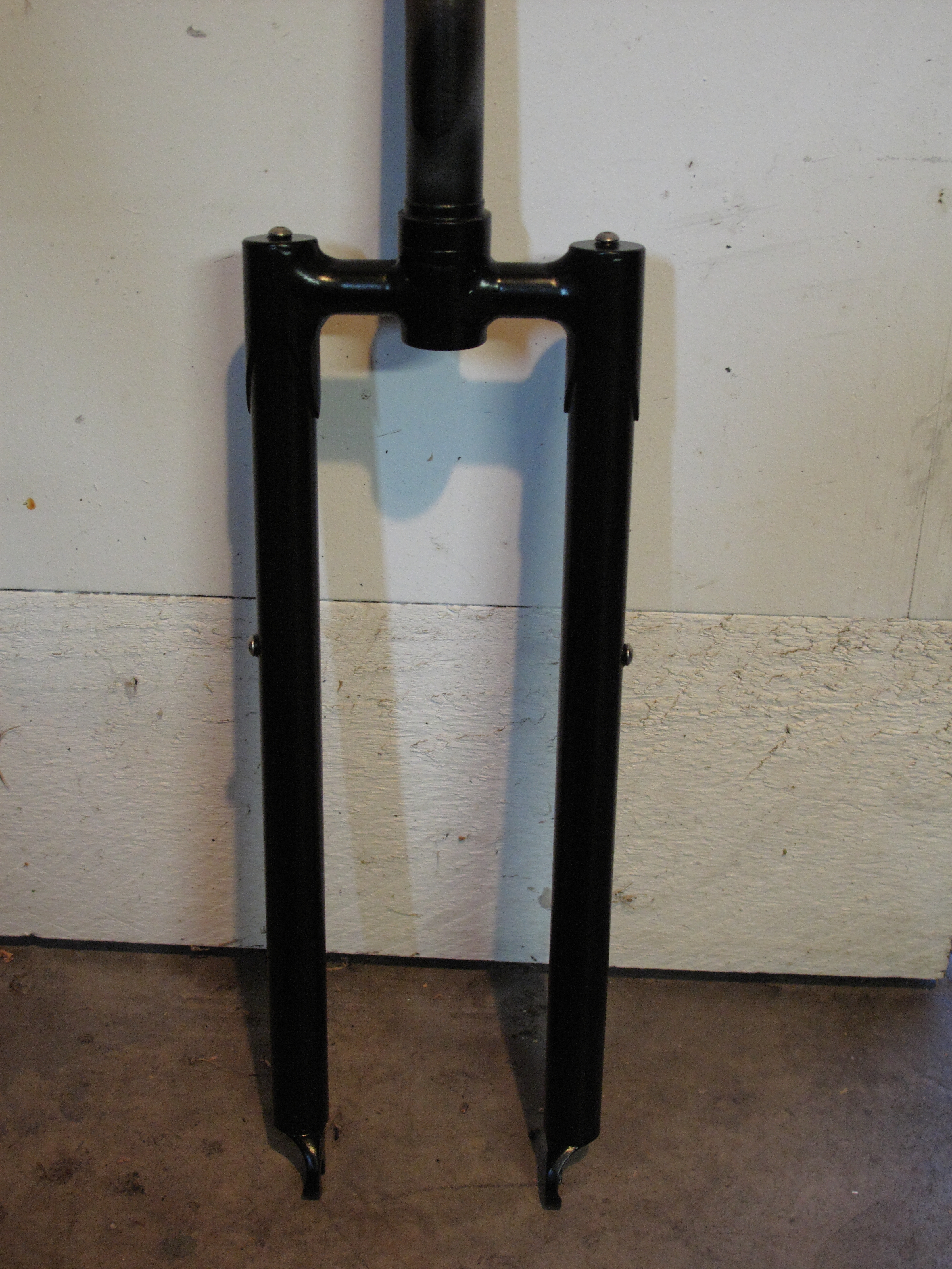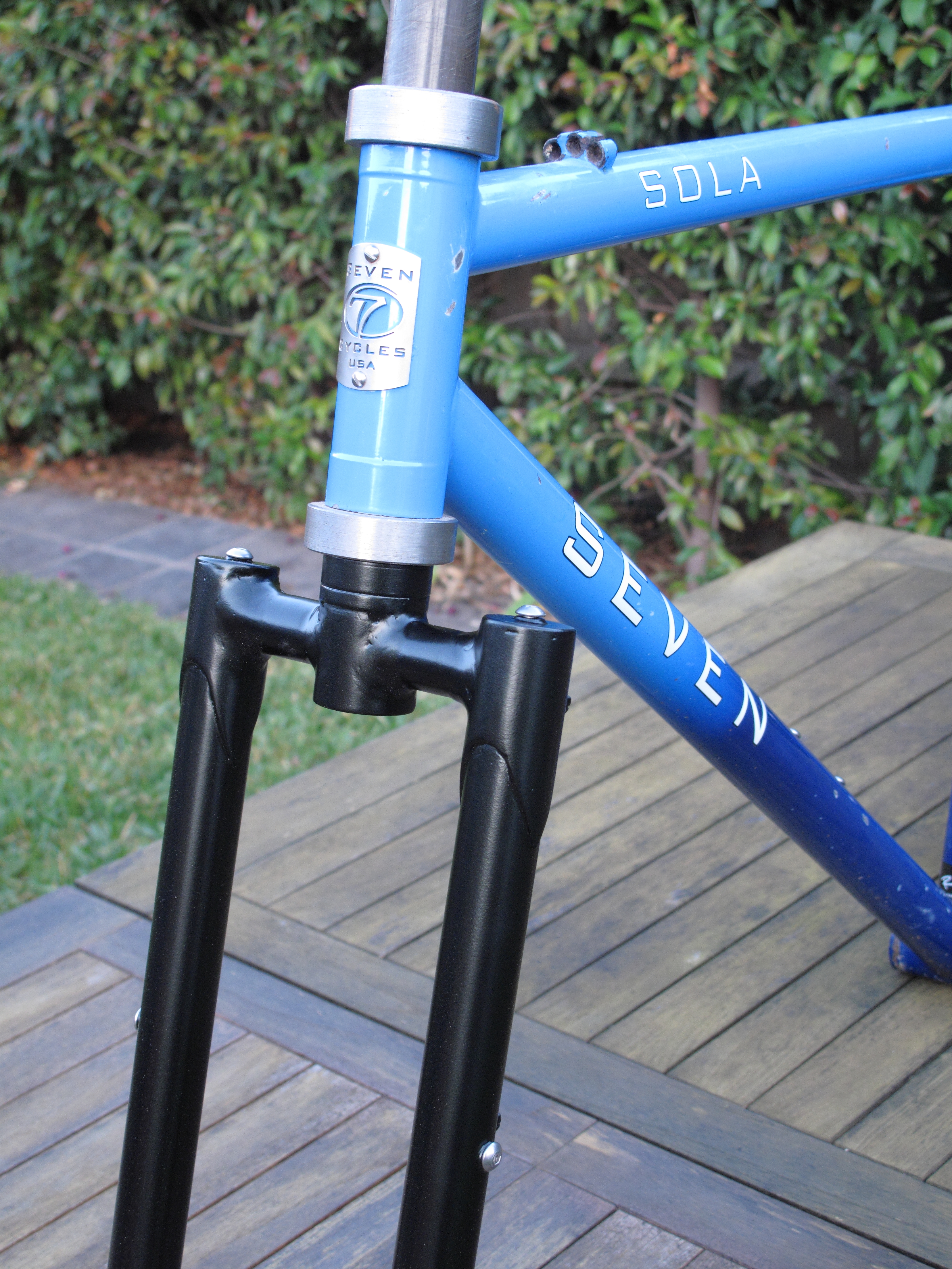 Just before Christmas I posted about building a rigid disc specific fork for a Seven mtb. https://gdukehandmadebicycles.com.au/2012/12/ This project has had more than one false start but after a couple of attempts and changes is finally finished. I don’t generally go for mismatched fork/frame combinations. I never really got the unicrown with lugged frame combination and don’t like the current wave of lugged crowns that you see on bikes that are tig welded together. While my preference is to build with lugs this has nothing to do with the method of construction,rather the aesthetic. I unashamedly like lugs. However ,the Seven in question is tig welded ,very nicely i might add. So I decided to build the fork in a fillet brazed fashion in order that it didn’t clash with the frame. The intention to set it up for light touring grew out of discussion, and was one of the reasons for delay. I took my inspiration for this build from a post I saw some years ago on Bob Browns web site http://bobbrowncycles.com/custom.htm. As you can see from the photos below this is a through tube construction that should never be at risk of failure and yet is hopefully at ease with the lugless look of the Seven
