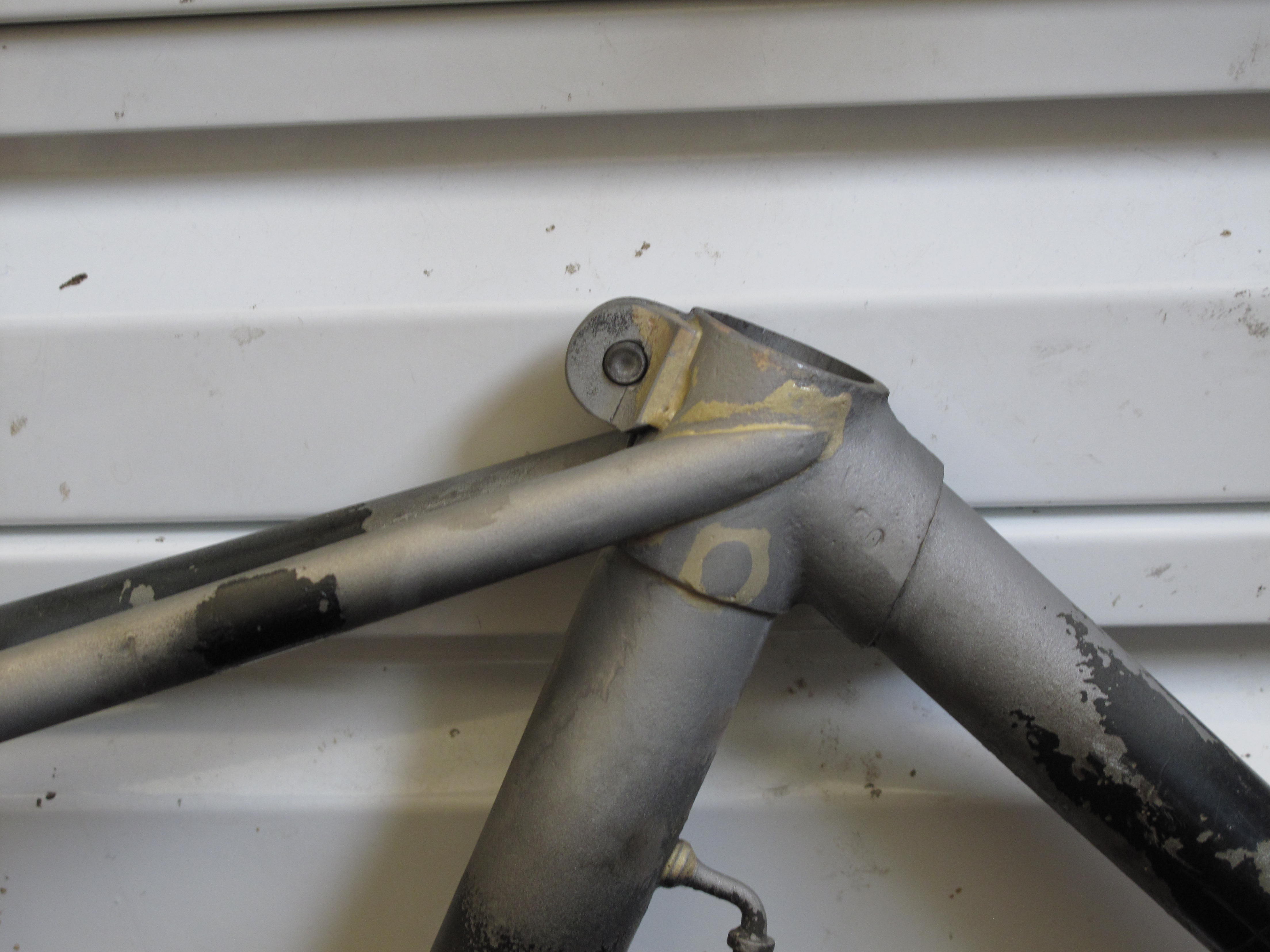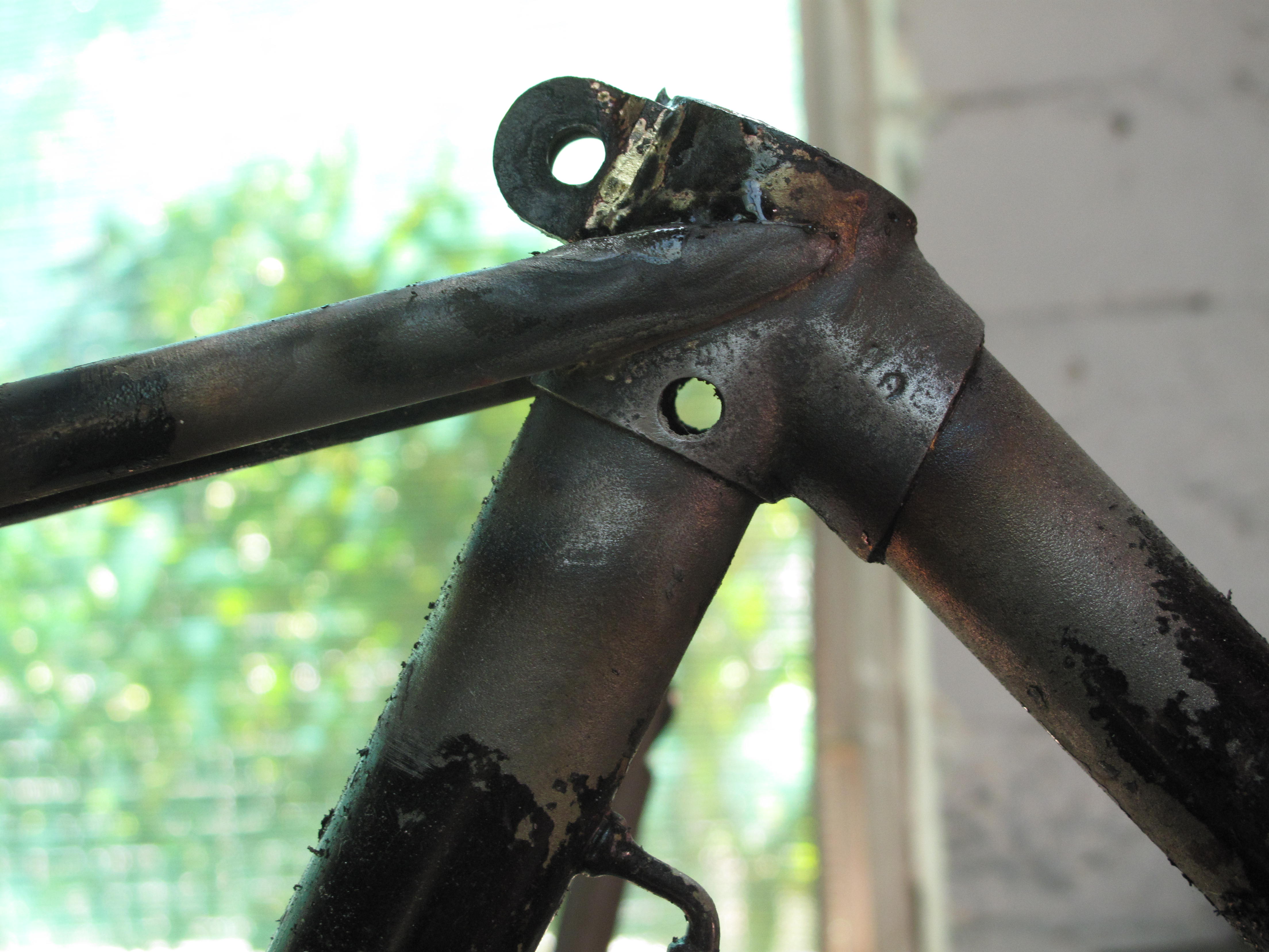 At some time somebody had managed to snap one of the seat lug ears off. I can only imagine that the cause of this is because they had used a seat post that was too small and had simply continued to tighten the binder bolt past the point of no return. Anyway, their method of repair was to drill a hole straight through the frame (and presumably the seat post) so that they could then put a bolt right through the lot and prevent the post from slipping down.