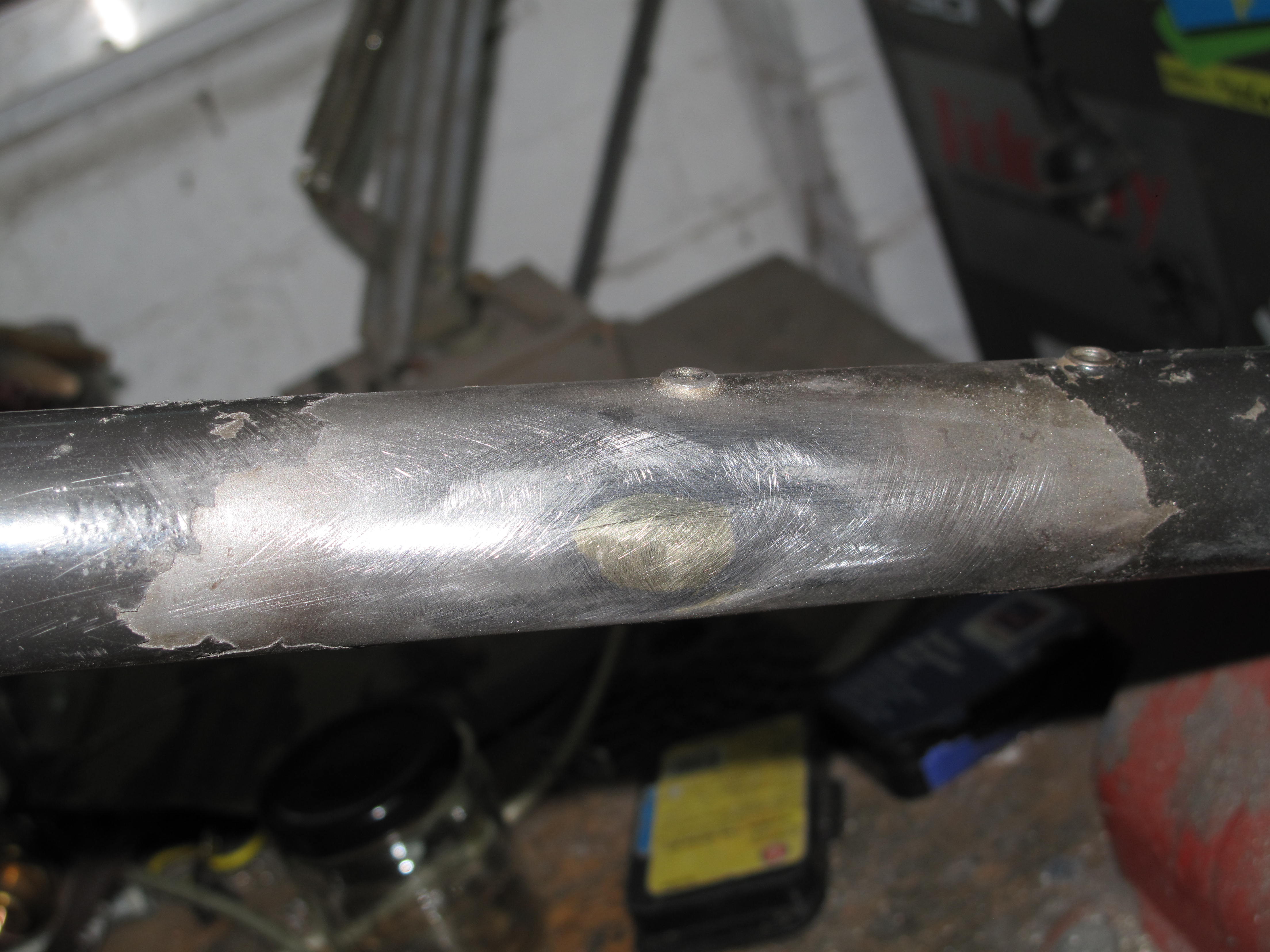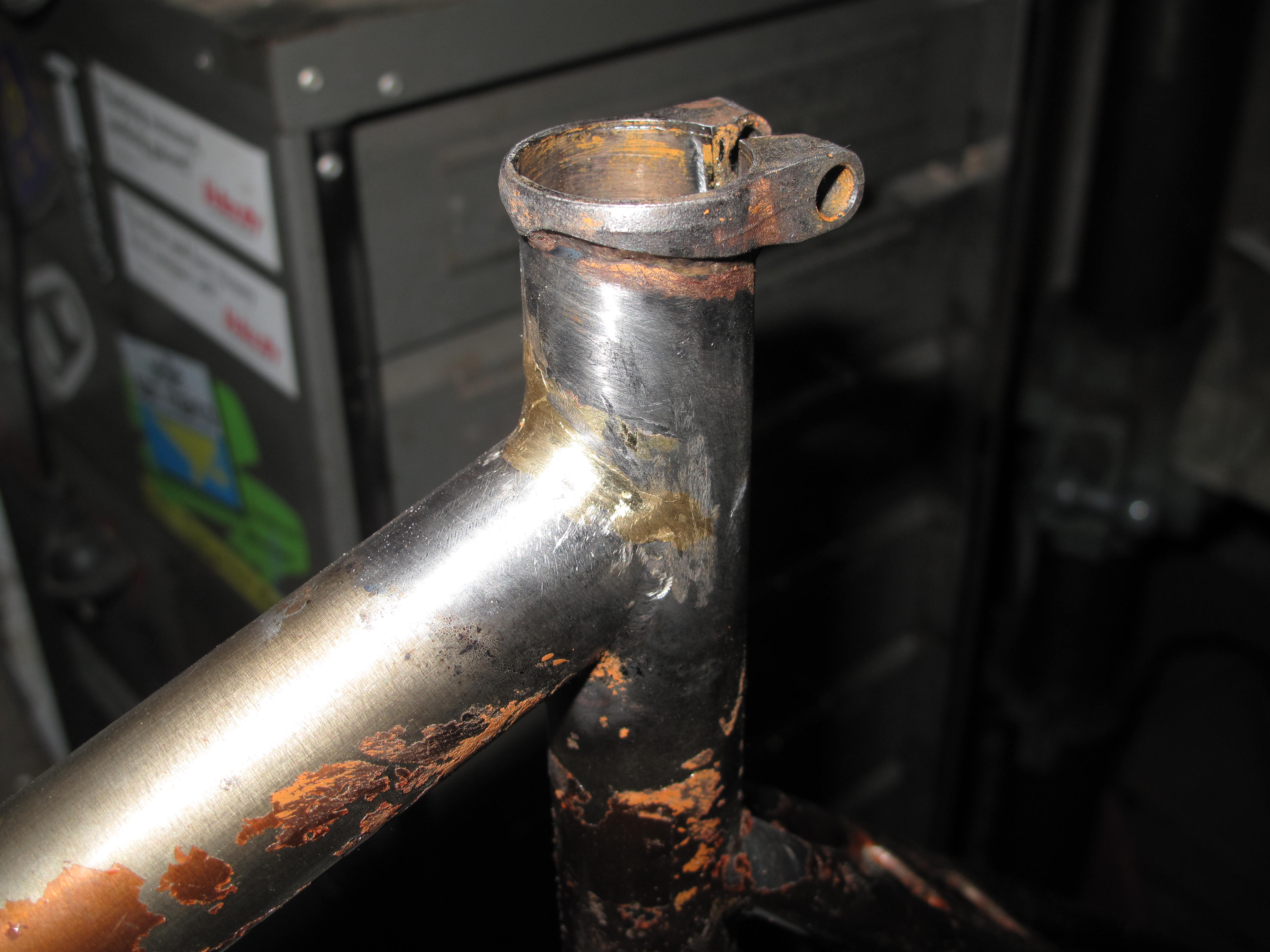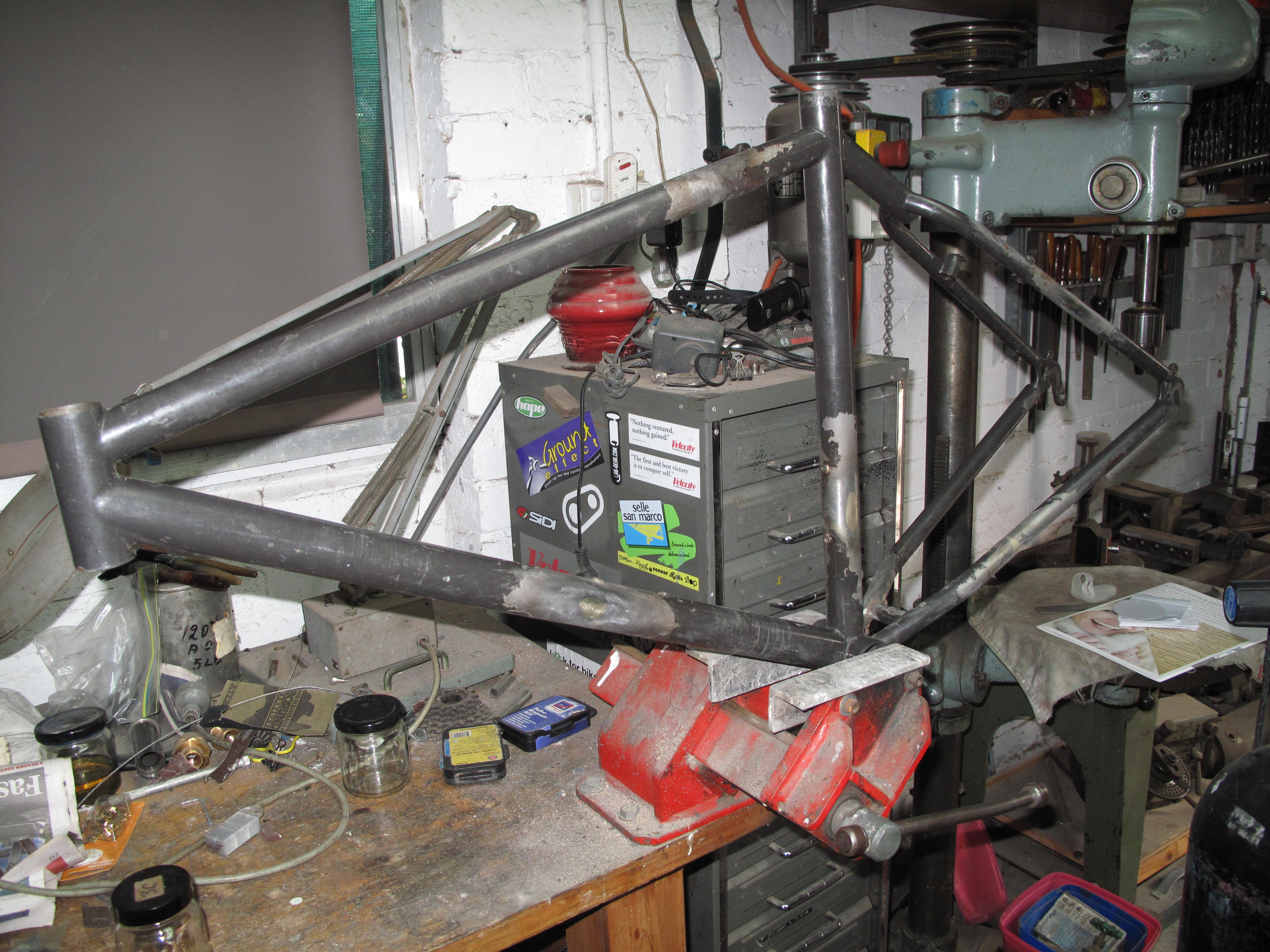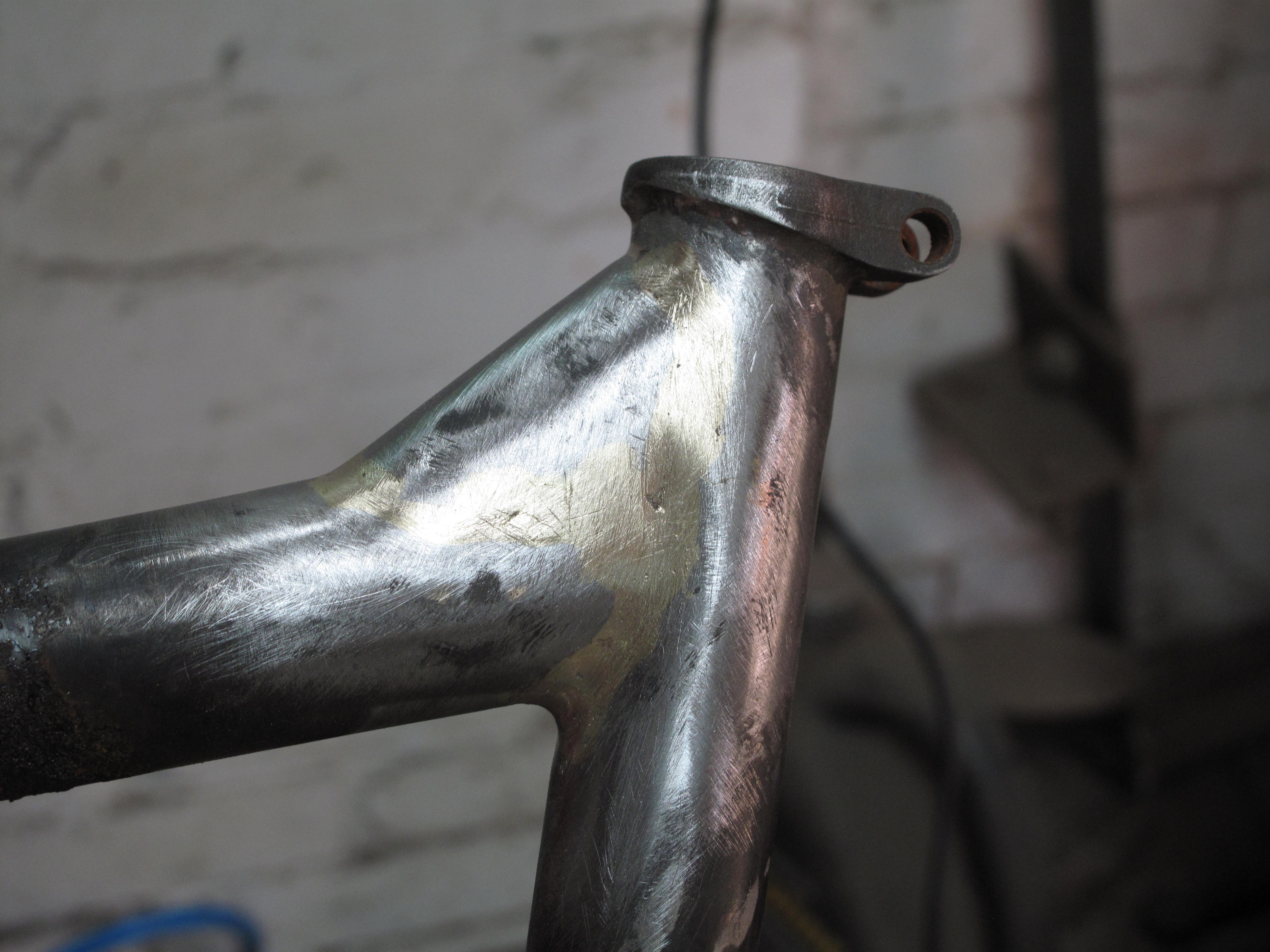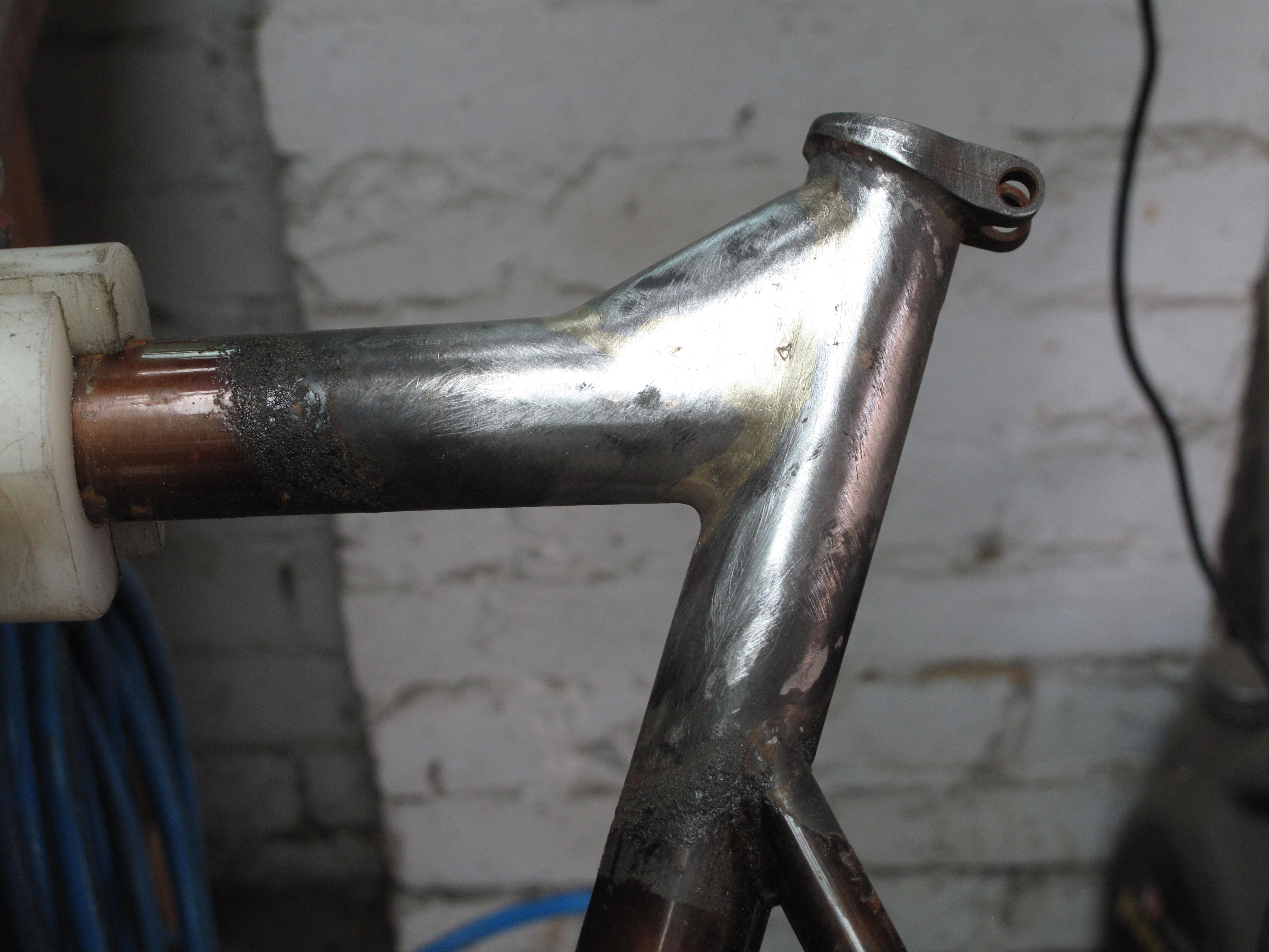 Nick turned up with a frame he had bought on a trip to The States. Not just any trip, his Honeymoon. Its a bit of an unknown quantity. We are wondering if it is the product of a beginner at a frame building school. While Nick really likes the bike it had developed a crack at the top of the seat tube. It presents as a tig welded frame and I could see where the inexperience of the welder had led to some serous undercutting in the weld. This would have weakened the frame leading to the crack. It is a very tall frame. When I took the paint off I discovered that someone had attempted to fill said crack with brass. After a discussion with Nick I agreed to lay a brass fillet right around the top tube / seat tube joint and fit a gusset on the top tube to strengthen up the junction. Nick comes from a mtb background so gussets are normal for him and I think this will extend the life of his frame substantially. Now he just has to decide on what colour to paint it