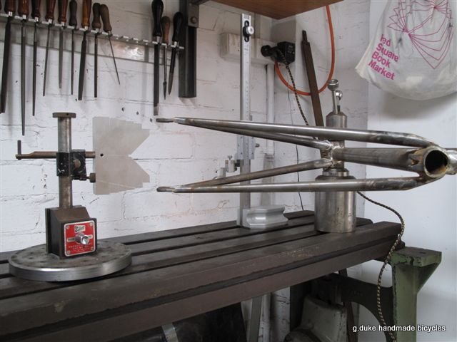Fork bending takes place in this hardwood mandrel. In most cases the blades come straight and if the frame has curved forks they are bent to the required amount of rake.